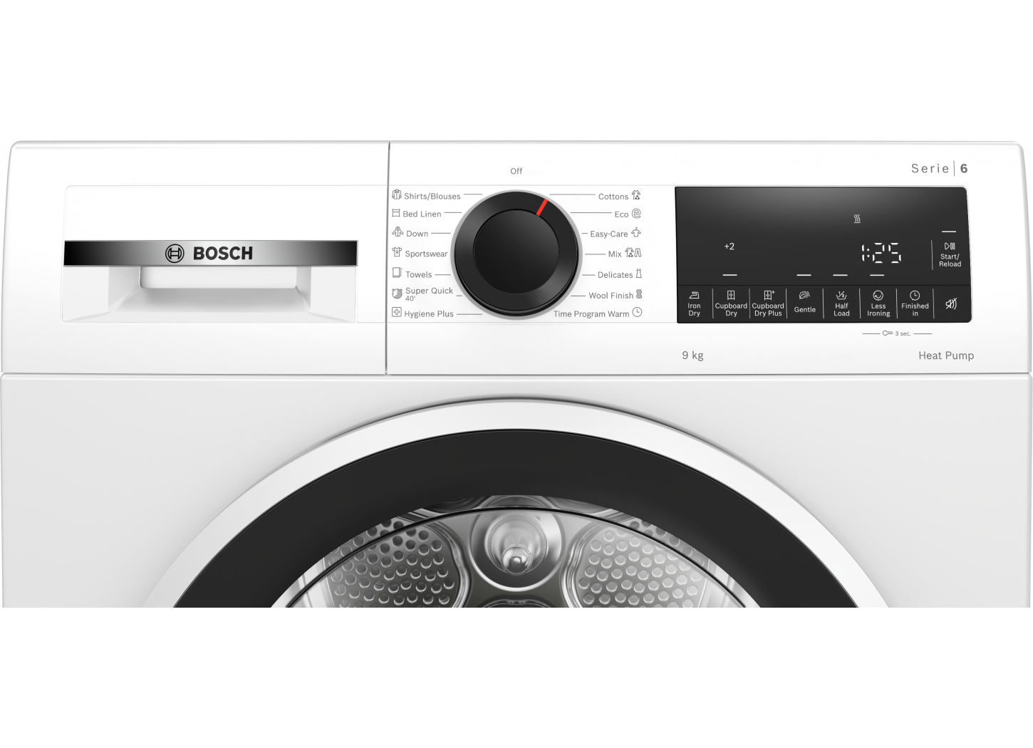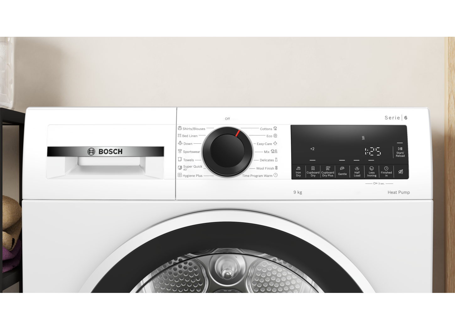• TouchControl gombok: vasalásszáraz, szekrényszáraz, szekrényszáraz+, időzítés, gyűrődésmentesítő program, kímélő, jelzés, indítás / utántöltés / szünet, féltöltet, 24 órás időzítés