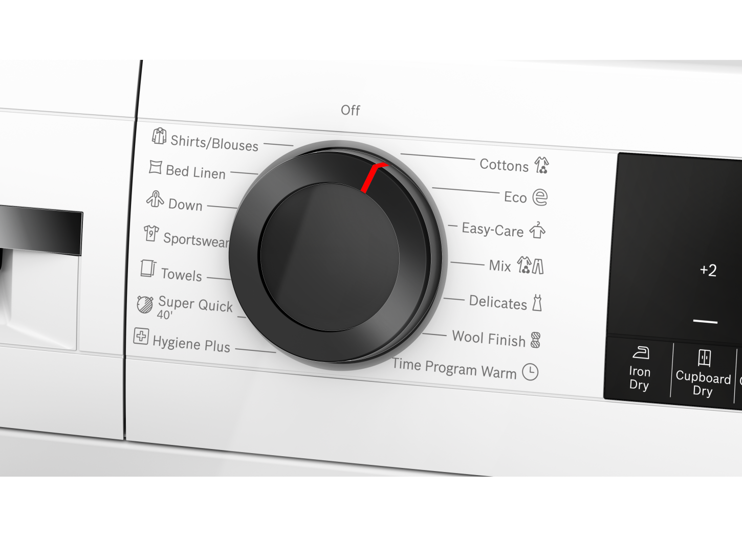 További működtetési opciók Gyapjú szárítás befejezése, Higiénia Plusz, Időzített program meleg, ing/blúz, Kényes anyagok, Lepedők, Pamut, Pamut Eco, Sportruházat, Szintetikus, szuper 40 perc, Tolltöltetű ruhák, Törölközők, Vegyes